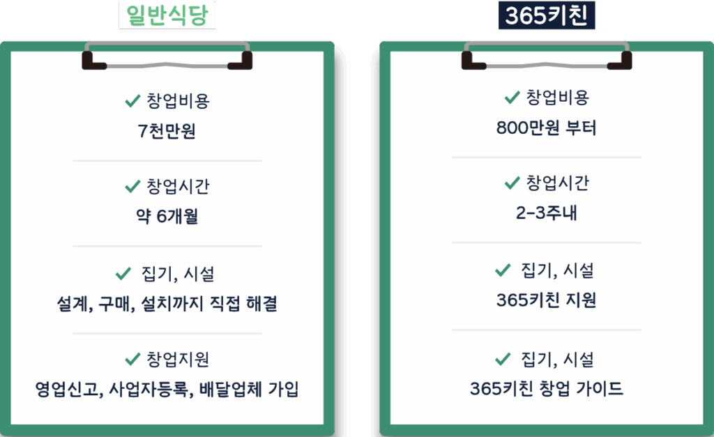 국내 1위 퀄리티 공유주방 365키친 사장님이 성공에 집중하는 동안,우리는 사장님에게 집중합니다. 입점문의 창업 고정 비용은 낮추고 사업 성장성은 높인다 풀옵션 주방과 창업지원 서비스를 만나보세요.월 임대료만으로 배달음식점 창업이 가능합니다. 방문예약 365키친 성과 이용만족도4.1/5점 파트너 문의46회 연간 상담수1,231회 고객리뷰 365키친 전문 매니저님의 데이터 기반 컨설팅으로 오픈 3개월만에 목표 매출을 달성했어요. 체계적으로 갖춰져 있어 불필요한 투자 비용을 줄일 수 있었고, 운영에 집중할 수 있었습니다. 김OO 처음엔 공유주방이 낯설었지만, 실제로 사용해 보니 우리 팀 규모에 딱 맞는 효율적인 선택이었습니다. 다른 브랜드와 나누는 정보와 노하우도 큰 도움이 되었습니다. 이OO 365Kitchen은 단순히 주방 공간을 빌려주는 곳이 아니라 함께 성장할 수 있는 플랫폼 같았습니다. 바로 사용할 수 있는 편리함과 깔끔한 위생 관리 덕분에 안심할 수 있었습니다. 박OO 자세한 사항이 궁금하시다면 직접 방문해보세요. 1:1 투어 및 상담을 도와드립니다. 방문예약